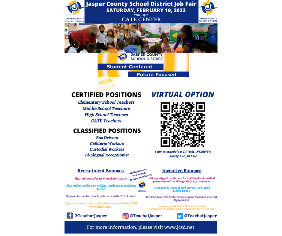 January 18, 2021 (Jasper County, S.C.) - Jasper County School District will resume in-person learning Monday, January 24, 2022. On January 19th, 20th and 21st, students are expected to log into classes, on time, and prepared to engage in a full day of learning. On Monday, January 24, 2022, please be reminded to bring your district issued technology device with you and ensure that it is fully charged.